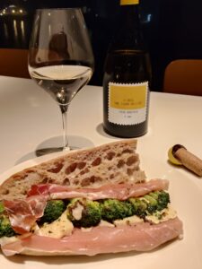 バゲットに塩気と旨みをまとったハモンセラーノ、ブリーチーズ、ブロッコリーを順に重ね、オリーブオイルと塩こしょうで仕上げるだけ。